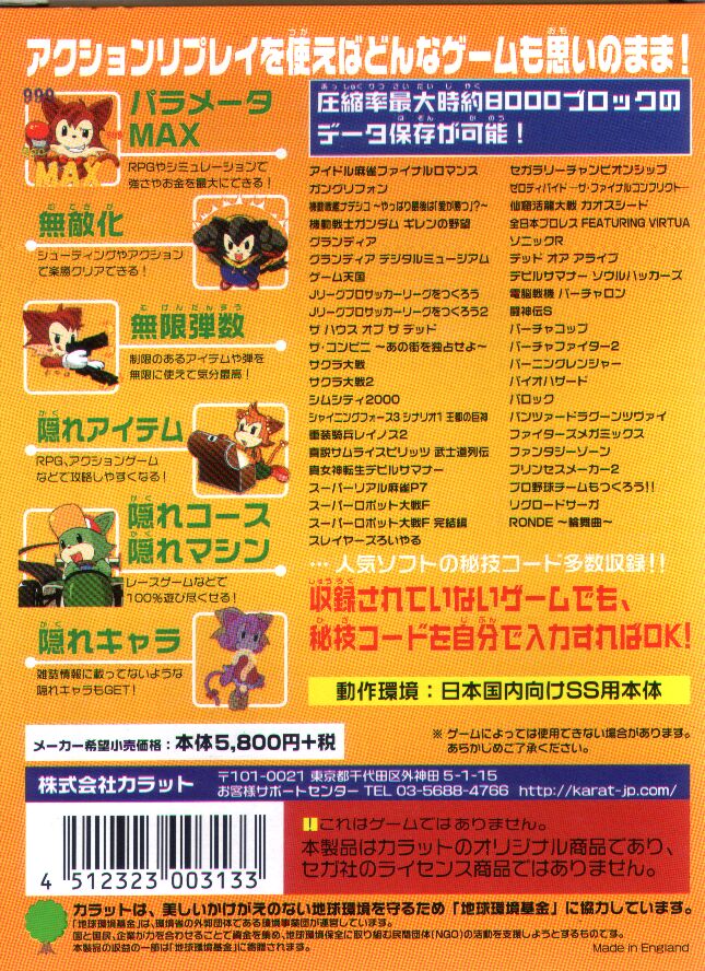 「SS用プロアクションリプレイ2」に内蔵されているゲームならこの「SS用プロアクションリプレイ」を買ってすぐに改造できます。